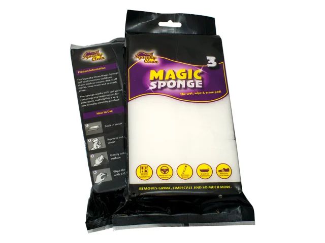 The Squeaky Clean magic sponge erasers will easily remove stubborn stains from most surfaces including kitchen appliances, bathrooms, windows & glass, tiles, toys and shoes.